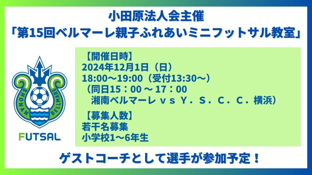 現在、小田原法人会様主催の「第15回ベルマーレ親子ふれあいミニフットサル教室」参加者を募集しております! 12月1日(日)、Y.S.C.C.横浜戦との同日開催です!